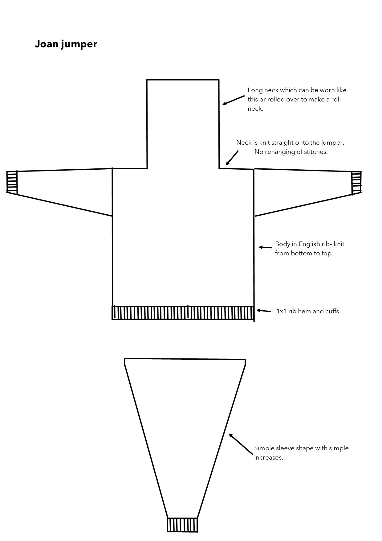 Joan is knit from the bottom up in two identical front and back panels, with simple shaping for the neck. The drop sleeves are fairly fitted using simple increases and attached after everything is knit. This pattern is could be completed in 2- 3 hours.